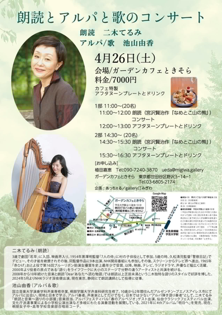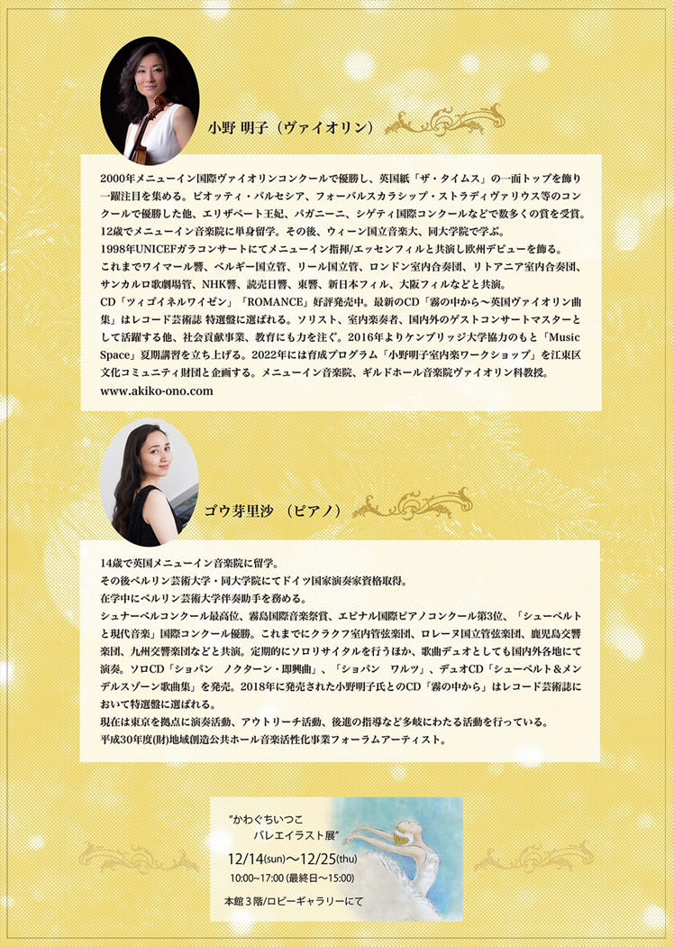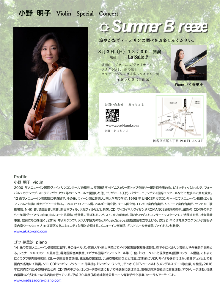 | ■ 小野 明子 Violin Concert のお知らせ 葉加瀬太郎氏が題名のない音楽会で「僕のヴァイオリンの先生です!」と称賛した話題の世界的ヴァイオリニスト! 12月21日(日) 新宿京王プラザホテル42階 【富士】 12:00開場 12:30~お食事 13:30コンサート 50名様限定 42階からの新宿の展望・お食事・素晴らしいヴァイオリンの演奏!! ひと足早い特別なXmasプレゼントです。 ¥20000(コース料理、ドリンク、コンサート、税込) お問い合わせ : あっちぇる 【チケットは問い合わせフォームからお申し込みください】 ![]() ![]() ■ 小野 明子 Violin 2025年 Special Concertのお知らせ 葉加瀬太郎氏が題名のない音楽会で「僕のヴァイオリンの先生です!」と称賛した話題の世界的ヴァイオリニスト! 8月3日(日) La Selle F 渋谷区広尾5丁目19-8 3F 「Summer Breeze」あなたへの特別な夏の贈り物 13:00開演 ¥5000(自由席) お問い合わせ : あっちぇる 【チケットは問い合わせフォームからお申し込みください】 ![]() ■ 朗読とアルパと歌のコンサート 2回の公演ともに満席となり、沢山のお客様にお越しいただきありがとうございました! 「春の素敵なお庭を眺められるギャラリーサロンでの朗読会です。ぜひお出かけを!」 2025年4月26日(土) 1部 11:00~(20名) 2部 14:30~(20名) 朗読 二木てるみ アルパ/歌 池山由香 ¥7000 (アフタヌーンプレートとドリンク付き) 会場/ガーデンカフェときそら お申し込み 植田嘉恵 090-72740-3870 ガーデンときそら 03-6805-2174 ![]() ■ 二木てるみ音楽と朗読公演2024’ 満席御礼! キャンセル待ちをご希望のお客様は、お名前と連絡がつきやすいメールアドレス、またはお電話番号をお知らせください。 2024年6月30日(日) 開演:18:00(開場17:00) 語りの小部屋『 風琴と魚の町 』 林芙美子・作 音楽 飯田俊明 17:15開場 18:00開演 ¥5000 (ワンドリンク付き) 会場:神楽坂 THE GLEE ( http://theglee.jp) チケットお問い合わせ:あっちぇる企画 配信のご案内! 配信URL https://twitcasting.tv/c:thegleemusic/shopcart/311493 ![]() ![]() ■ 小野明子 & ゴウ芽里沙 満員のお客様にお越しいただきありがとうございました! Tea Time Concert 2024年4月7日(日) 開演:14:00(開場13:00) 会場:神楽坂 THE GLEE チャージ料金 ¥5,000(1ドリンク込み) ( http://theglee.jp) チケットお問い合わせ:あっちぇる企画 ご予約承ります。お支払いは当日会場受付でお願いします。 曲目 バッハ:ピアノとヴァイオリンのためのソナタ BWV1017 メンデルスゾーン:無言歌集より「甘い思い出」 ラフマニノフ:ヴォカリース フォーレ:ヴァイオリン・ソナタ Op.13 など予定 ★ツイキャスにてライブ配信決定! ご来場が難しい皆様への朗報です。 小野明子&ゴウ芽理沙 Teα Time Concert 〜時代を越えた甘美なメロディー〜 https://twitcasting.tv/c:thegleemusic/shopcart/297990 ★2022.10.7.放映 題名のない音楽会に、葉加瀬太郎と共にバイオリンの恩師として出演! https://www.tv-asahi.co.jp/daimei_2023/backnumber/0028/ ![]() ![]() ■ Akihiko Kaneko Trio LIVE at the glee 2024年2月10日(土) 開演:18:00(開場17:00) 会場:神楽坂 the glee ( http://theglee.jp) チケットお問い合わせ:あっちぇる企画 ![]() ■ RINA Trio Concert 2023年10月18日(水) 開演:18:30(開場18:00) 会場:入間市産業文化センターホール ( 入間市向陽台 1-1-7) チケットお問い合わせ:TEL04-2964-8377 ![]() ![]() ■ RINA LIVE in Morioka GOOD NEWS! 盛岡市中ノ橋通の新盛岡バスセンター内に、世界的ジャズピアニスト秋吉敏子さん(92)=米国在住=の足跡を伝えるミュージアムがあります。 そこに隣接する世界でたった一つの穐吉敏子JAZZミュージアム併設のカフェバー Cafe Bar West38 https://akiyoshi-jazz.com/west38/ ![]() ここで9/23RINA ソロライブ開催! 15:00 19:00入れ替え制 チャージ¥3500 お申し込み tel 080-6036-0038 (10:30〜21:00) --------------------------------------------- ■ 2023年8月11日 千葉県柏市 麗澤大学 廣池千九郎記念講堂 RINA スペシャルトリオ(井上陽介、中村海斗)19:00スタート ■ 2023年5月20日(土) 王子ホール RINA Transparent Blue 発売記念 ピアノ・ソロ・コンサート 17:30開場、18:00開演、 ![]() ■ RINA 待望のセカンドアルバム5/17発売 あっちぇるでもご予約申込承ります。 ![]() ■ 2023年4月9日(日) 杉並公会堂 RINA Piano Recital 19:00開場、19:30開演、 ![]() ■ 2023年2月27日(月) 神楽坂 THEGLEE 二木てるみ ~音楽と朗読~語りの小部屋2023 13:00開場、14:00開演、15:30終演予定 入場料 全席自由 5000円(お飲み物と軽食付き) ![]() ■ 2023年2月28日(火) 神楽坂glee RINA Trio open/start 18:00/19:00 artist RINA(Pf)、小田桐和寛(Dr)、佐藤潤一(Ba) ticket MC:¥4500+1ドリンク別途(¥800)+1オーダー ※入場時に1ドリンク代頂戴しております。 ※1オーダー以上の追加のご注文をお願いしております。 ![]() ■ 2023年2月3日(金) 神楽坂glee 2月3日 RINA ソロライブ ¥3500チャージ +2オーダー 18時開場 1st19時 2nd20時 02/03 FRI RINA Solo LIVE open/start 18:00/19:00 artist RINA(Pf) ticket MC:¥3500+1ドリンク別途(¥800)+1オーダー ※入場時に1ドリンク代頂戴しております。 ※1オーダー以上の追加のご注文をお願いしております。 ![]() ■ 2022年11月27日(日) 小さなオーケストラによる親子のための音楽会 「ピーターと狼」 11:00開演(10:30開場) 13:30開